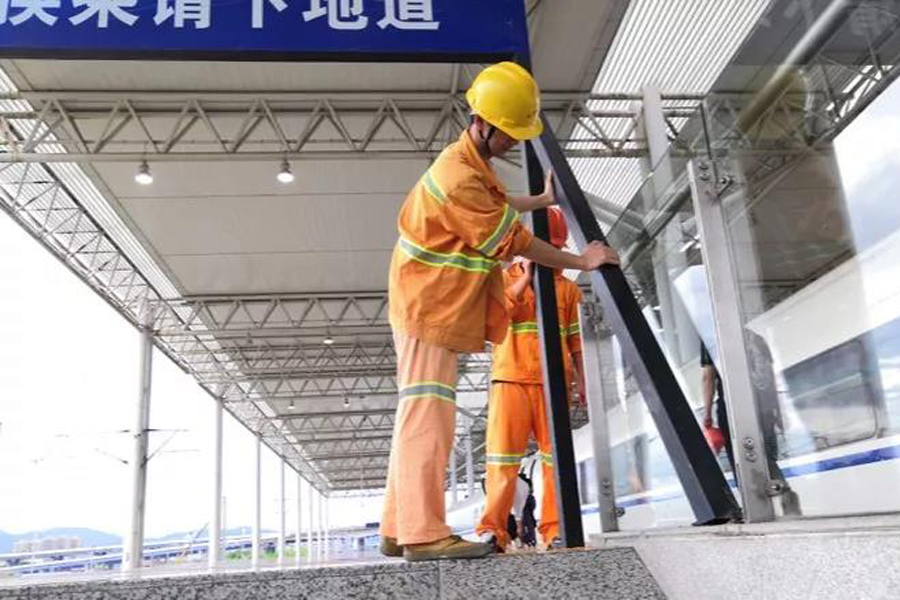 杭州房建公寓段宁波车间积极做好站台广告牌、导向牌加固整治工作,确保台风期间房建设备安全万无一失。(上海铁路 供图)